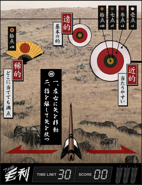 矢を射るには、矢を左右にドラッグして位置を定め、指を離すと矢が放たれます。