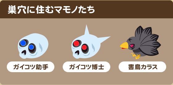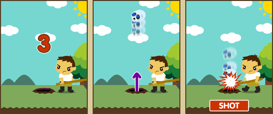 【3・2・1】のカウントダウン後、巣穴からマモノが飛び出しますので、マモノが落ちてきたところを【SHOT】ボタンを押しタイミングよく打ってください。マモノの種類・打つタイミングにより飛距離が変わります。その飛距離がスコアに換算されます。